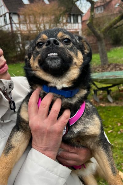 HUNDENAME hat eine Narbe auf der Schnauze. Dies ist in Rumänien nicht unüblich. Viele Menschen glauben dort noch heute daran, dass man Hunde vor Krankheiten schützt, wenn man ihnen die Schnauze verbrennt. Die Narbe beeinträchtigt diese Fellnase jedoch keineswegs.