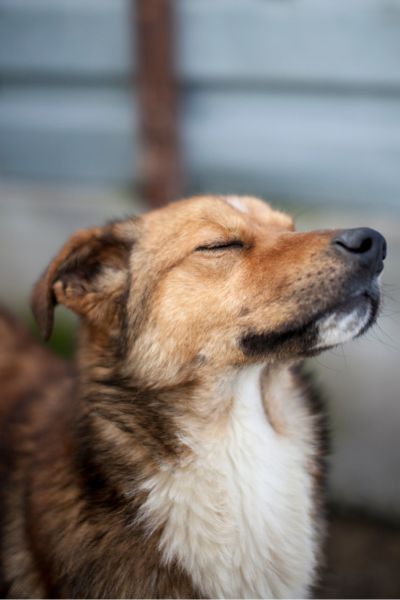 Brauner Rüde Richie mit weißer Brust schaut nach oben in die Kamera
