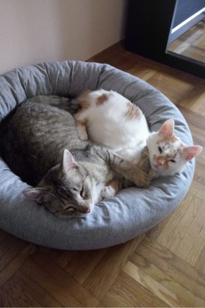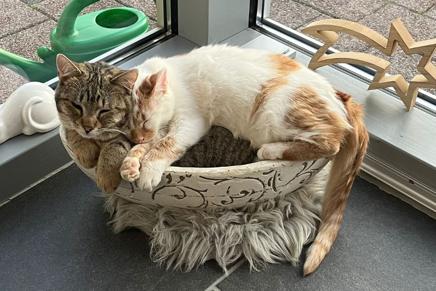 „Die beiden sind trotz ihrer unterschiedlichen Charaktere ein Herz und eine Seele. Ich liebe es, sie beim Spielen oder Kuscheln zu beobachten. Sie brauchen und suchen sich gegenseitig ständig. Wir drei sind ein gutes Team geworden und freuen uns auf noch viele gemeinsame Erlebnisse.“